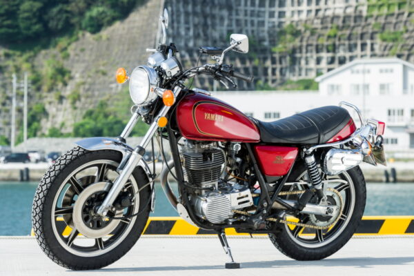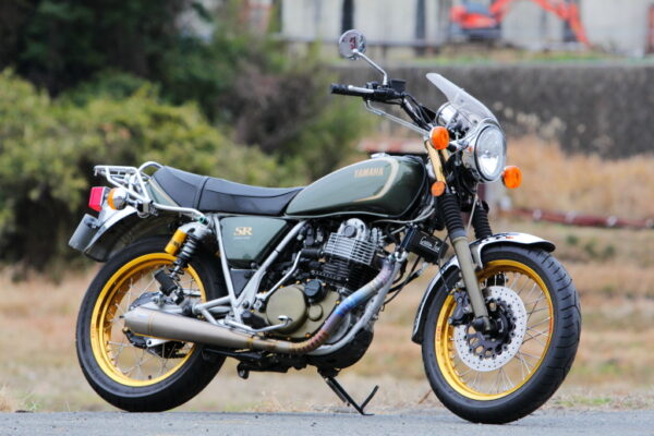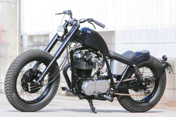 スタイリングはひと目見て分かる通り、70年代ロングフォークチョッパー。同店が得意とするオールドスクールスタイルである。が、やはりSRでこのスタイリングをここまで再現するのは流石のひとこと。当時主流だったハーレーのVツインや国産空冷4気筒とも異なるサイズ感を持つSRの単気筒エンジンをベースに、違和感のない車体バランスを実現しているのは、じつはかなり難しいことである。2%ERのセンスが光るポイントだといえよう。